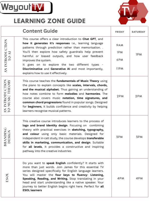 Episode times for the entire Way2Learn broadcast schedule.